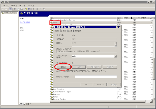Windows サービスに nginx が登録されていることを確認し、“開始”をクリックすると nginx が起動し、稼働状態となります。
